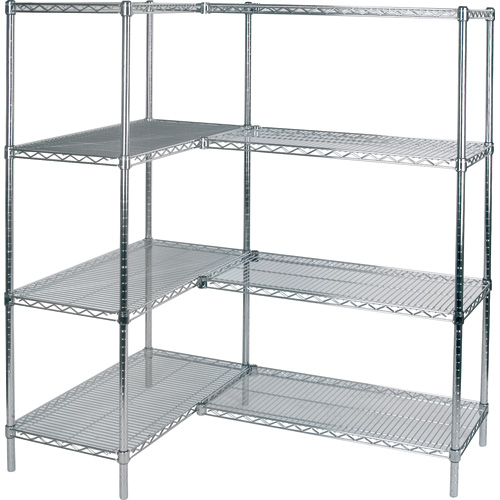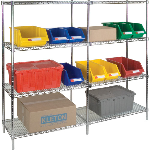 Tablettes chromatées de fort calibre avec un concept de treillis ouvert qui minimisent l’accumulation de poussière, améliorent la circulation de l’air et offrent une plus grande visibilité des produits entreposés