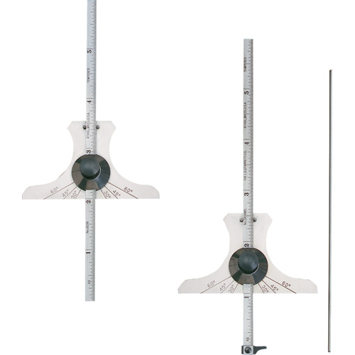 Une règle revenue graduée avec précision à la machine est fixée par glissement sur la tête et peut être bloquée en place au moyen d’un écrou moleté