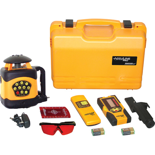 Comprend: niveau laser, bloc-pile NiMH, adaptateur de 6 V, télécommande, détecteur de faisceau, cible magnétique, lunettes teintées et mallette de transport