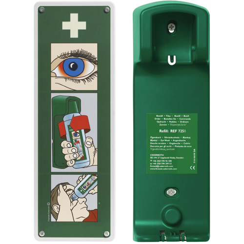 Support mural pratique à double fonction pour ranger les bouteilles de solution ophtalmique Cederroth, ouvre aussi la bouteille lorsqu’elle est retirée du support pour une utilisation immédiate
