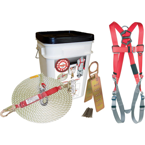 Comprend: harnais style veste avec connexions en traverse, ancrage de toiture réutilisable, cordage de sécurité de 50′ en polyester/polypropylène 5/8″ et longe antichoc 2′